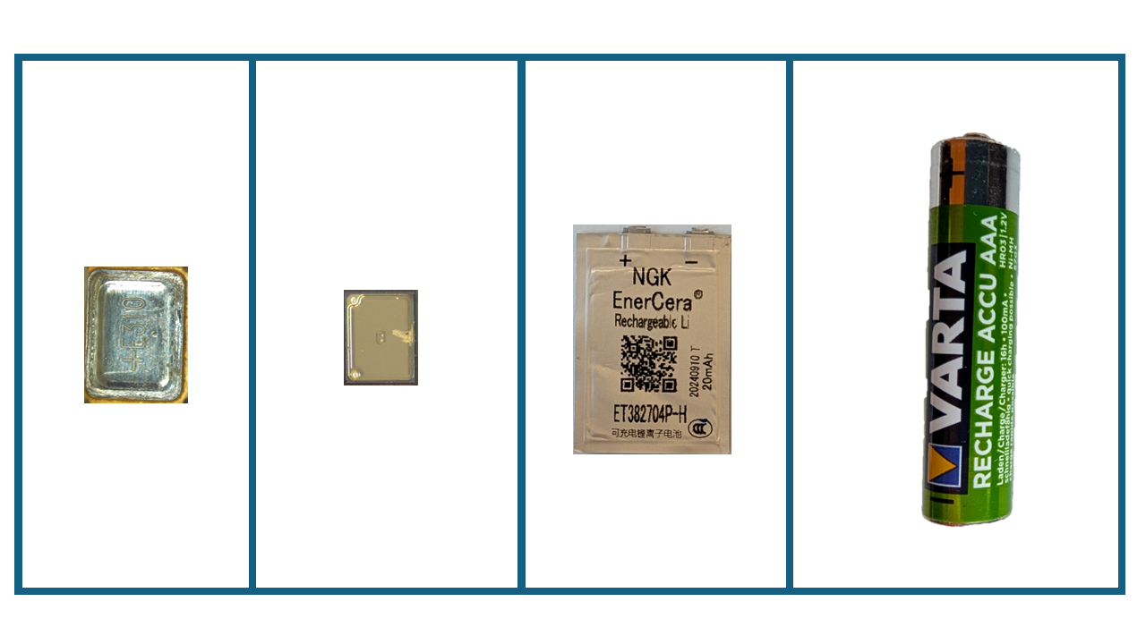 Verschiedene Technologien für Energiequellen, von links nach rechts: Superkondensator, wiederaufladbare Festkörper-Mikrobatterie, wiederaufladbare Li-Ionen-Pouch-Batterie, wiederaufladbare NiMH-Batterie in zylindrischer Form (Grössen nicht massstabsgetreu). Abbildung: Helbling